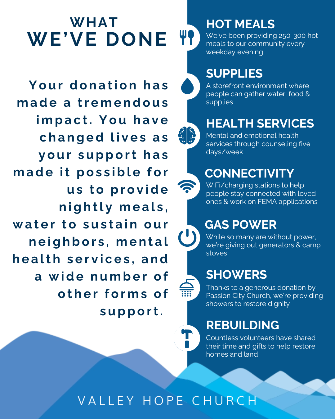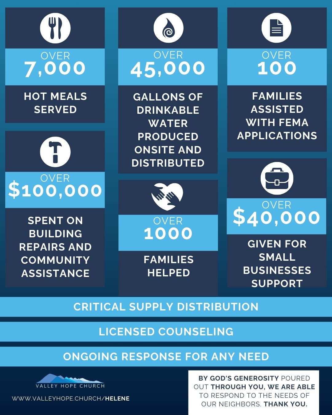 Through God’s generous provision, we have provided 14 vehicles, 4 RVs, and rental/utility assistance to 40+ families, along with just shy of 24,000 meals gathered around the table together. All meals have been provided by external organizations, businesses, churches and individuals and served at Valley Hope Church.