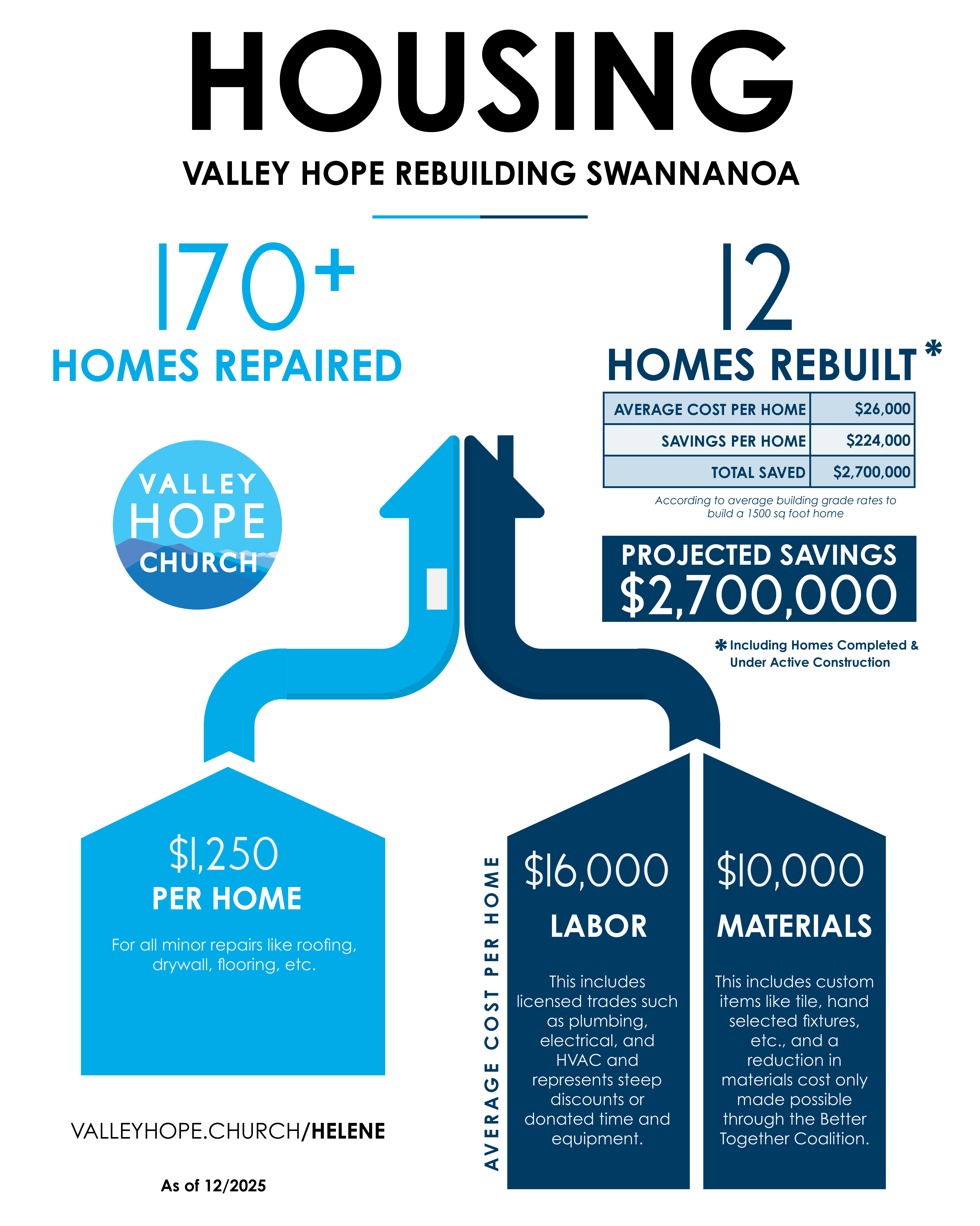 These are savings of approximately $224,000+ per home according to average building grade rates to build a 1500 sq foot home, representing an estimated $2.7 million in costs saved across 12 total home rebuilds in Swannanoa. This savings projection includes completed homes as well as homes under active construction.