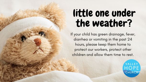 If your child has green drainage, fever, diarrhea or vomiting in the past 24 hours, please keep them home to protect our workers, protect other children and allow them time to rest.