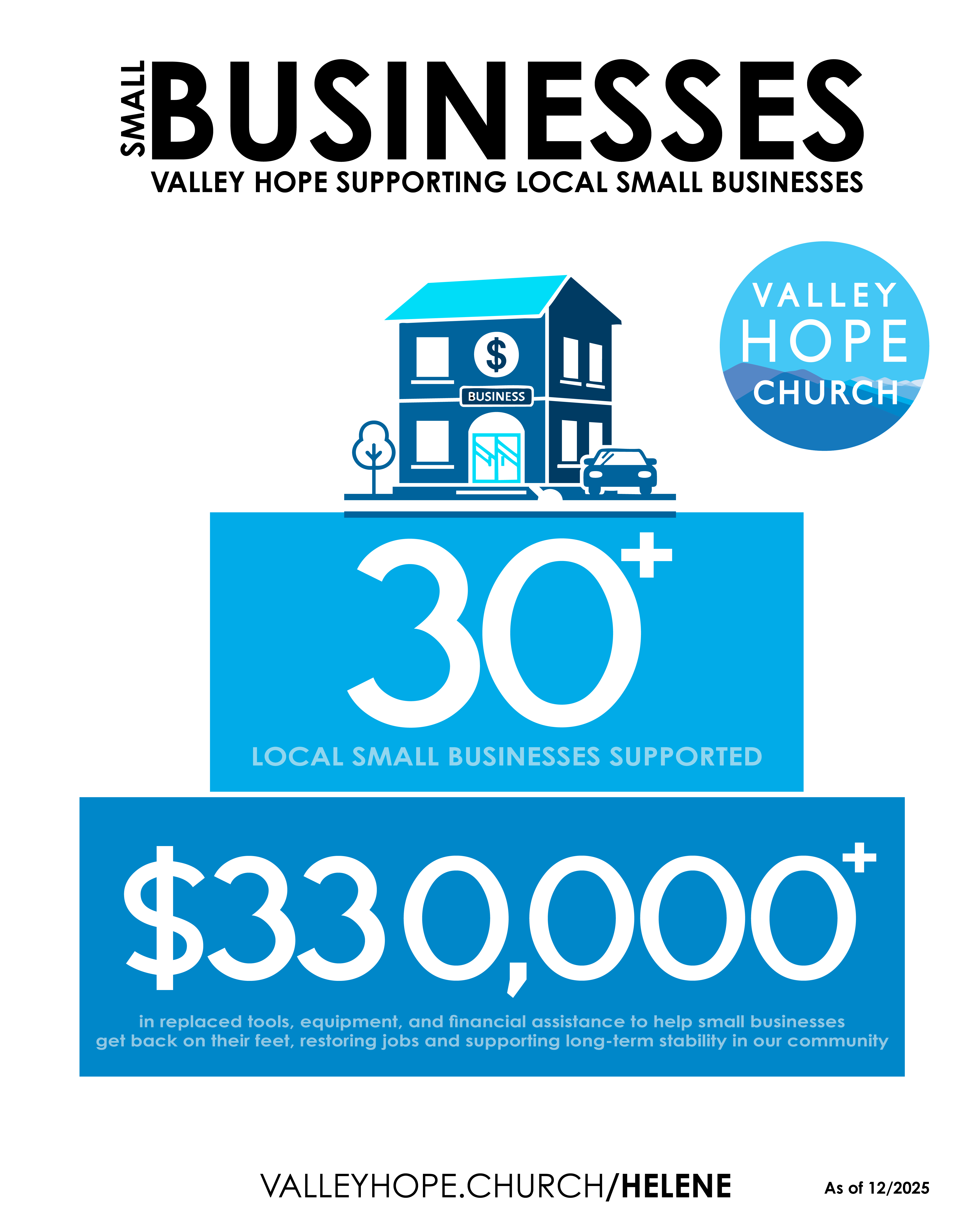 Valley Hope has supported more than 30 local small businesses with more than $330,000 in replaced tools, equipment, and financial assistance to get back on their feet, restoring jobs and supporting long-term stability in our community.