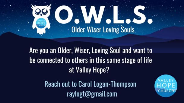 Are you an Older, Wiser, Loving Soul and want to be connected to others in this same stage of life at Valley Hope? O.W.L.S. are our seniors at VHC. You may be single, married, a grandparent, retiree, etc. Reach out to Carol Logan-Thompson at