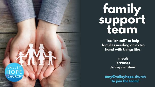 We are seeing a need to have a team of people who are willing to be "on call" to support people who are trying to "make it" on their own. The church family is a GREAT place to find caring people who want to follow the call of Jesus to have mercy on our neighbor (Luke 10:25-37), especially the stranger, poor, widow and orphan. This may include making a meal, helping them run errands, driving them to work and taking them home, etc. This is an opportunity to cultivate communities that live out the life-changing hope of Jesus. Please prayerfully consider how you and/or your family may be involved. Email