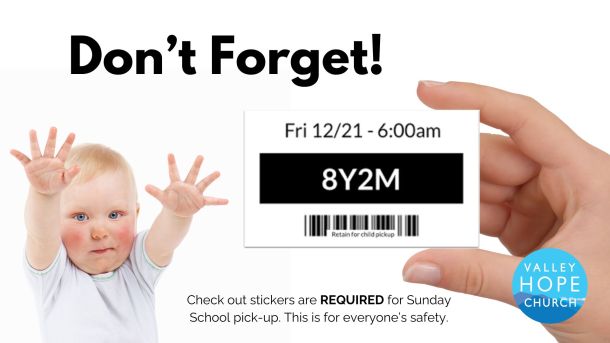 Don't Forget! Stickers are REQUIRED in order to pick up your children from Sunday School and other Children's Ministry events. This is for everyone's safety.